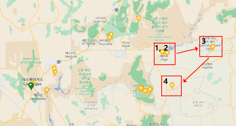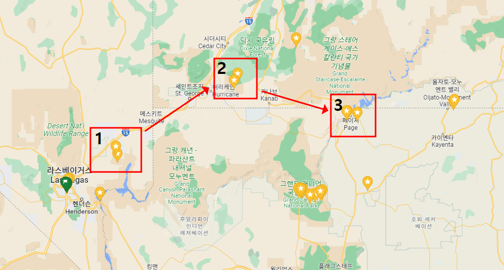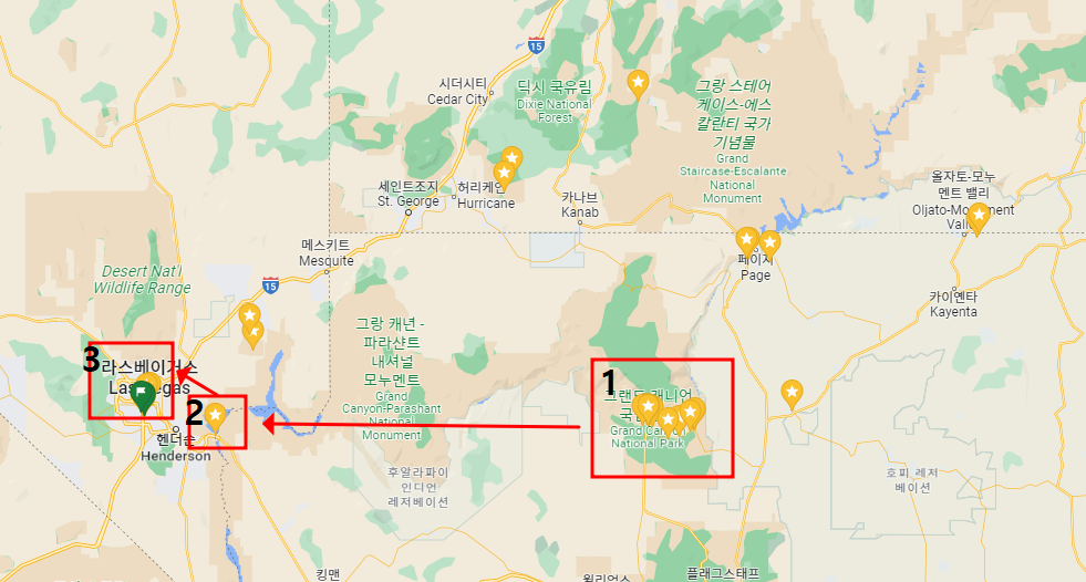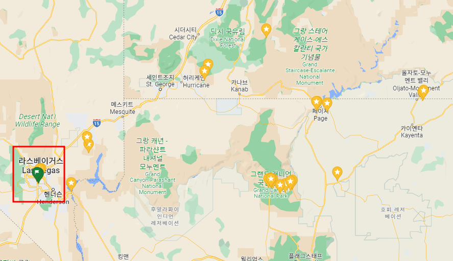 이번 글에서는 라스베이거스부터 - 그랜드캐년(그랜드캐니언) - 모뉴멘트밸리 까지 이어진 루트에 있는 여행코스들에 대하여 다뤄보고자 합니다. 이번 글은 저의 개인적인 여행후기를 기반으로 작성되었기 때문에 저희 취향이 많이 반영되어 있다는 점 참고 부탁드립니다.