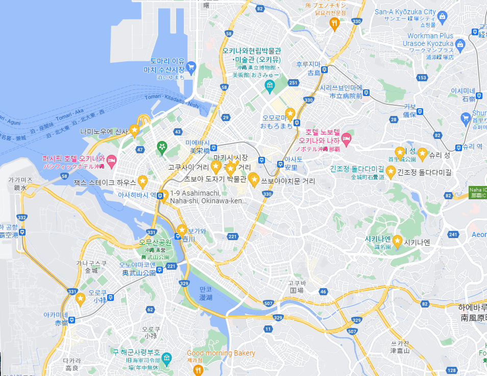 ─ 나하 시내(국제거리 근처): 오키나와 섬에서 가장 번화한 곳에 위치하며 여행의 시작과 끝에 많이 들리는 곳.