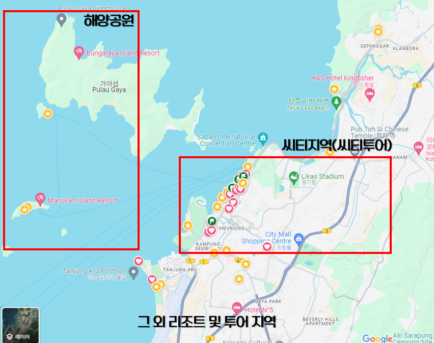 코타키나발루 여행코스는 크게 시티지역, 툰쿠 압둘 라만 해양공원, 석양포인트 그리고 각종 엑티비티로 구성되어 있습니다. 많은 일정들이 투어사를 끼고 하는 경우가 많으며(이 부분은 따로 정리하여 포스팅 하겠습니다.) 이번 글에서는 투어사 없이 주로 방문하는 곳들 위주로 정리하였습니다.
