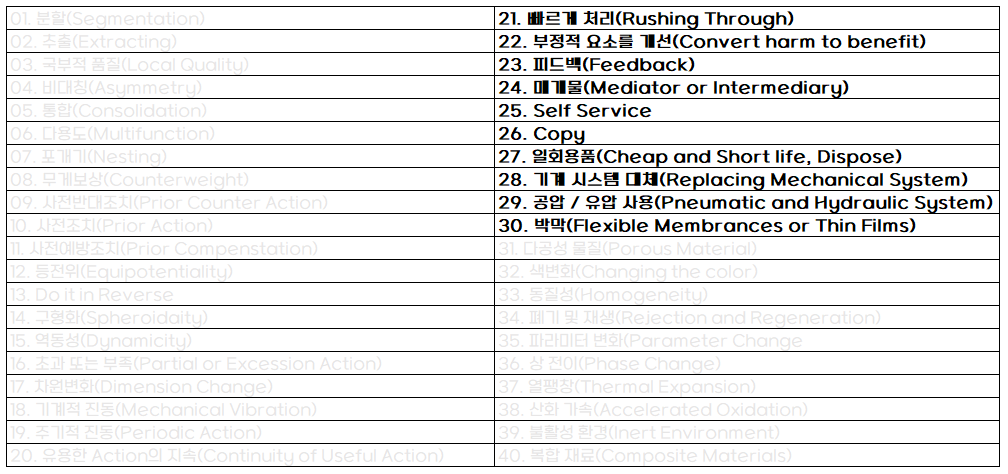 | 트리즈(TRIZ) 기법 5편 - 40가지 발명원리(31번 ~ 40번) (0) | 2022.08.22 |