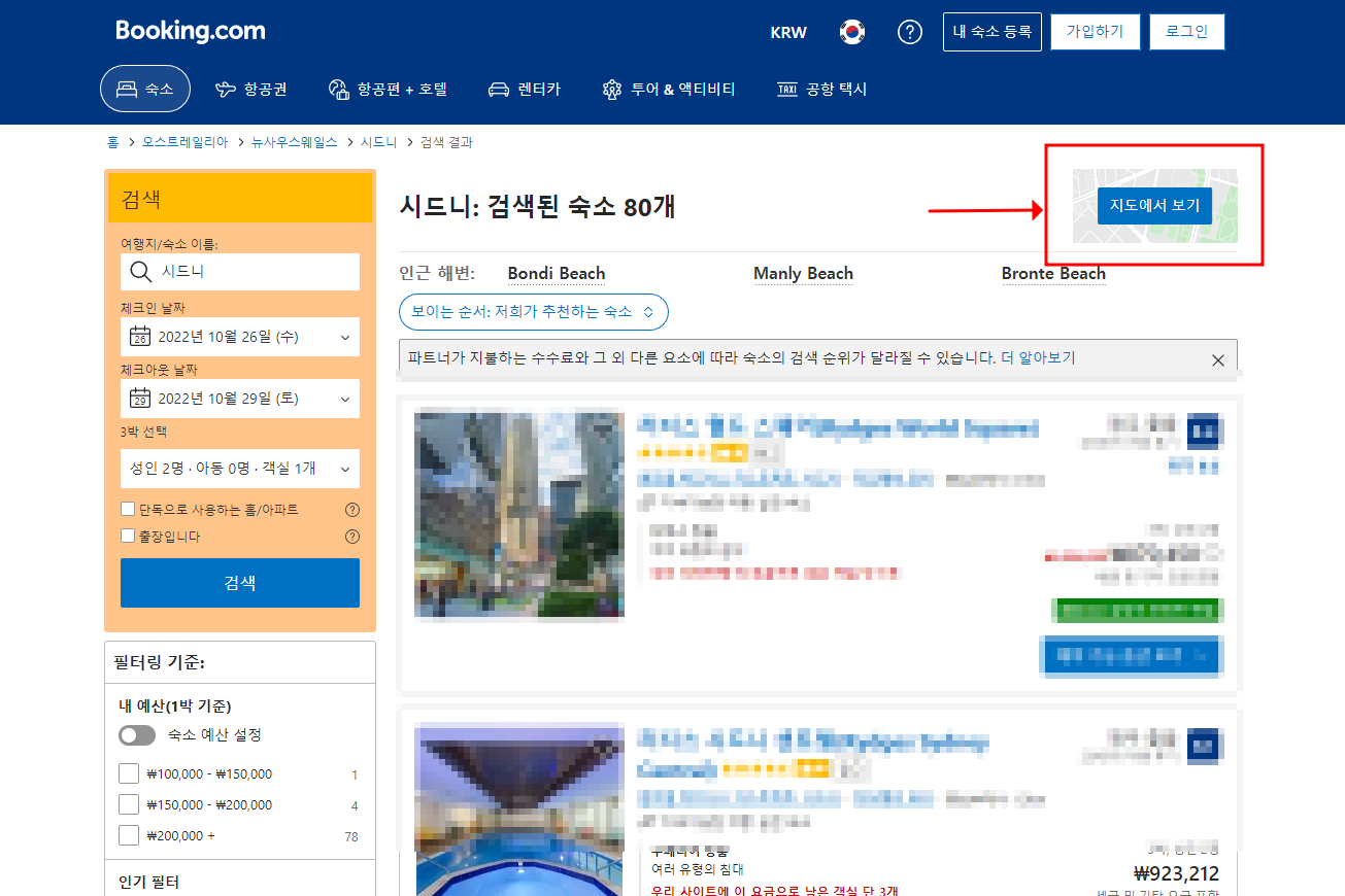 부킹닷컴에 접속하셔서 목적지와 기간을 입력하시면 아래와 같은 창을 보실 수 있으며, 표시된 "지도에서 보기"를 클릭해 줍니다.