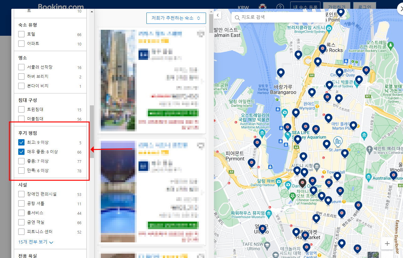 지도에서 보기를 클릭하시면 아래와 같이 지도를 볼 수 있는데, 이때 왼쪽의 필터링 기능을 사용하면 양질의 숙소만 쉽게 보실 수 있습니다. 이 필터링 기능이 제가 부킹닷컴 지도 기능을 추천드린 이유 중 하나입니다. 개인적으로 꼭 추천드리는 필터링 기능은 후기 평점 기능이며, 반드시 8이상을 걸어두고 선택하시는 것을 추천드립니다. (개인적으로는 8.5 이상 숙소만 이용하려고 합니다. 주관적인 의견이며 참고만 부탁드립니다.) 이를 통해 본인이 원하는 장소에서 보인이 원하는 옵션을 가진 숙소들의 리스트를 뽑을 수 있습니다.
