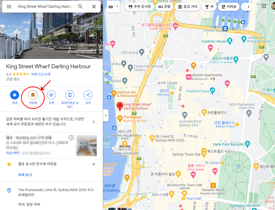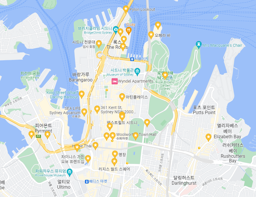 구글맵은 아래와 같이 본인이 가고 싶은 곳들을 표시할 수 있으며 이를 통해 본인의 루트를 한 번에 알 수 있습니다. 아래는 제가 표시한 예시중 하나이며, 시드니를 예를 들어보았습니다. 여행지 표시가 끝났다면 다음 스텝에서는 똑같은 위치의 지도를 부킹닷컴을 통해 확인하시면 됩니다.
