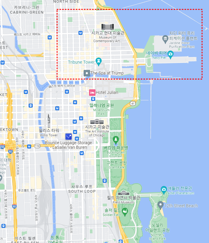 ─ 시카고 다운타운 기준 북쪽에 위치한 지역입니다. 주로 쇼핑을 하러 많이 가는 곳이며, 그 외에 네이비피어, 시카고 현대미술관, 360 Chicago 등이 위치하고 있습니다.